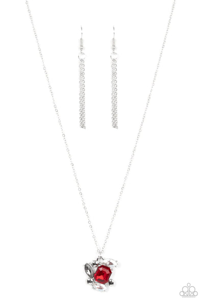 A glitzy collection of dainty silver studs, an emerald cut red, and smoky and iridescent marquise cut rhinestones delicately coalesce into a clustered pendant, resulting in a timeless sparkle below the collar. Features an adjustable clasp closure.