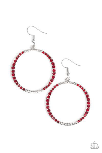 A studded silver hoop is encrusted in sections of glittery red rhinestones for a refined look. Earring attaches to a standard fishhook fitting.
