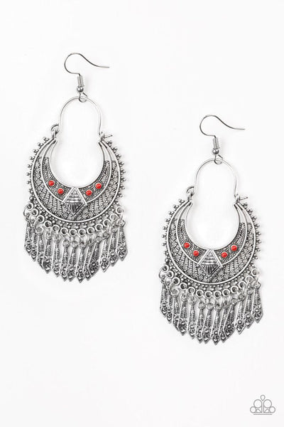 Dotted in tribal inspired textures, flared silver bars swing from the bottom of an ornate silver crescent. Dainty red beads and a shimmery silver diamond-shape frame embellish the frame for a seasonal finish. Earring attaches to a standard fishhook fitting.