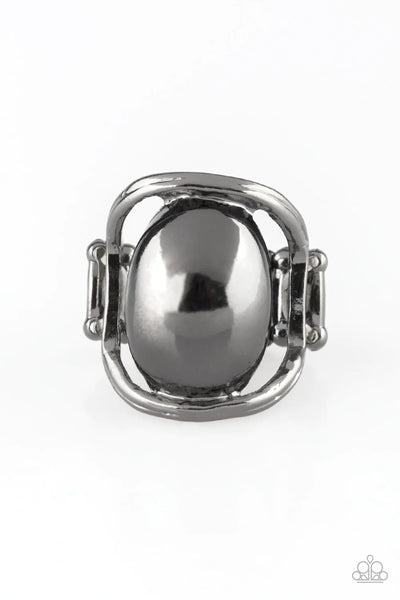 Glistening gunmetal frames curl around a beveled gunmetal disc, creating an edgy frame. Features a stretchy band for a flexible fit.