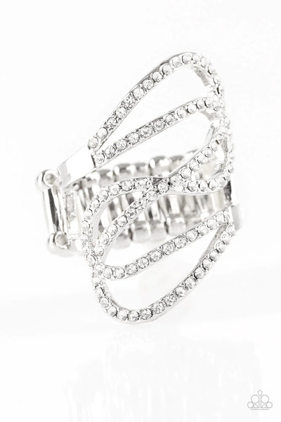 Encrusted in glittery white rhinestones, sparkling silver ribbons swoop across the finger for a refined look. Features a stretchy band for a flexible fit.