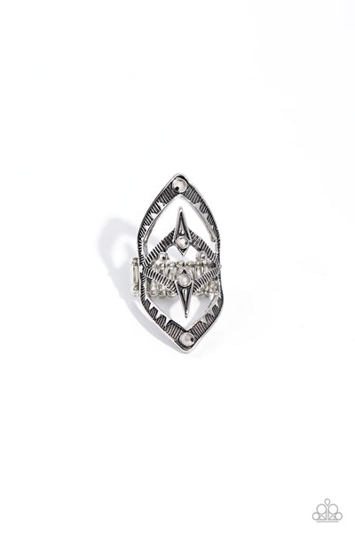 A pair of hematite-spotted, textured, airy, silver diamond-shaped frames arc up the finger, culminating into an edgy centerpiece. Features a stretchy band for a flexible fit.