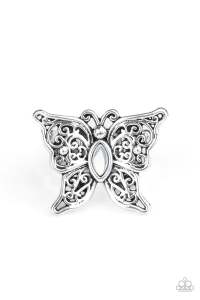 Lacy silver wings bloom from an opalescent white cat's eye center, coalescing into a whimsical butterfly atop the finger. Features a stretchy band for a flexible fit.