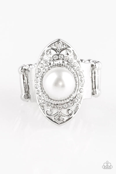 A pearly white bead sits atop an ornate silver frame, creating the illusion of a floating centerpiece. Glassy white rhinestones are sprinkled along the frilly frame for a glamourous finish. Features a dainty stretchy band for a flexible fit.