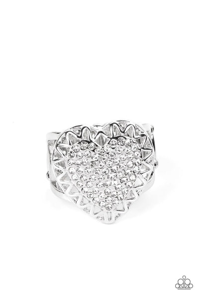 An airy silver frame with cutouts resembling a subtle zig-zag pattern, wraps around a heart filled with brilliant white rhinestones to create a dazzling centerpiece atop the finger. Features a stretchy band for a flexible fit.