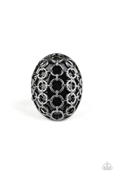 Glistening gunmetal links connect into a wire-like mesh across the front of an oval black cat's eye stone, creating a bold statement piece atop the finger. Features a stretchy band for a flexible fit.