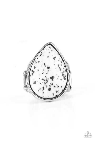 A generous polished white stone infused with black flecks is encased in a simple silver teardrop frame resulting in a seasonal finish atop the finger. Features a stretchy band for a flexible fit.