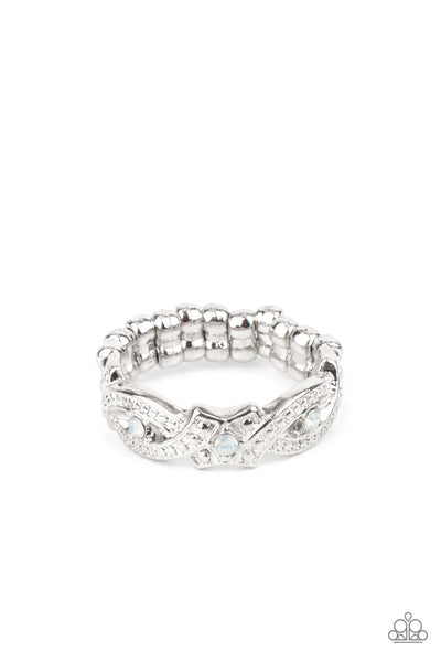 Dotted with dainty white opal rhinestones, studded silver ribbons delicately weave across the finger for a timeless elegance. Features a dainty stretchy band for a flexible fit.