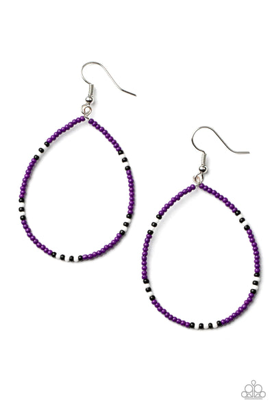 Broken up with sections of black and white seed beads, a dainty collection of purple seed beads are threaded along an invisible wire, creating a colorful teardrop. Earring attaches to a standard fishhook fitting.