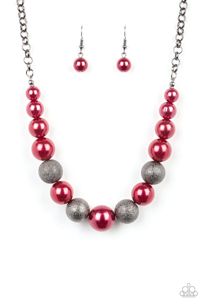 Necklace: Dusted in glitter, sparkling gunmetal and pearly red beads are threaded along an invisible wire below the collar for a glamorous look. Features an adjustable clasp closure.