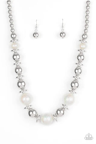Brushed in a stellar iridescence, hammered pearly beads, classic silver beads, and silver discs gradually increase in size as they join below the collar for a glamorous look. Features an adjustable clasp closure.