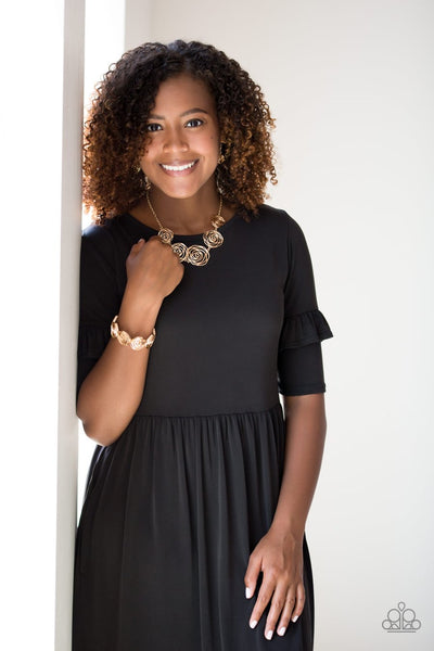 Necklace: Gradually increasing in size near the center, radiant gold bars spin into charming rosebud frames below the collar for a whimsical look. Features an adjustable clasp closure.
