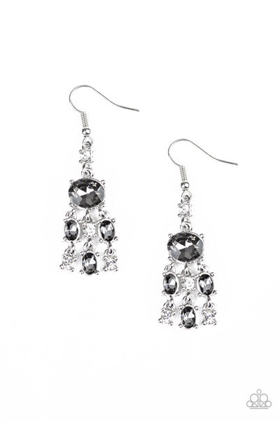 Featuring round and oval cuts, a dainty collection of smoky and white rhinestone frames drip from the bottom of a smoky oval rhinestone, coalescing into a glamorous lure. Earring attaches to a standard fishhook fitting.