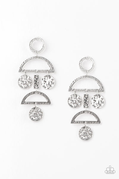 Delicately hammered and etched in shimmery textures, a collection of silver discs and silver frames connect into a tribal inspired lure.