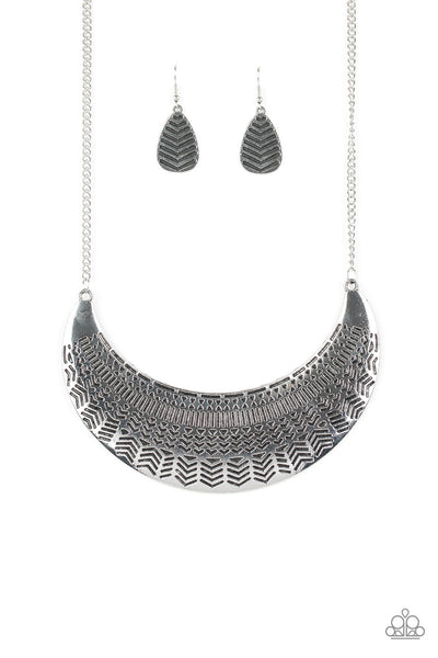 Stamped in an assortment of geometric patterns, an oversized silver half-moon pendant swings below the collar for a bold tribal style. Features an adjustable clasp closure.