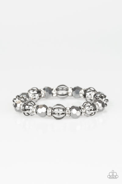 A collection of airy silver beads, glittery hematite rhinestone beads, and white rhinestone encrusted rings are threaded along a stretchy band around the wrist for a glamorous look.