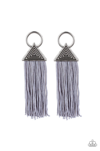 Shiny Paloma cording streams from the bottom of a hypnotic triangular frame attached to an airy hoop, creating a dramatically tasseled look. Earring attaches to a standard post fitting.