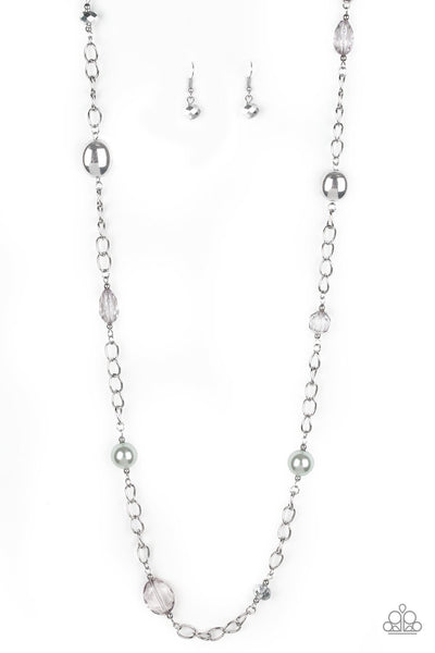 A collection of crystal-like, shiny silver, and pearly silver beads trickle down a shimmery silver chain for a refined flair. Features an adjustable clasp closure.