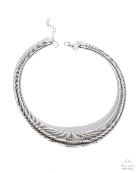 Spanning from glistening silver cap fittings, a collection of sleek silver links gradually increases in size coalescing below the neckline for a thick herringbone-like haute display. Features an adjustable clasp closure.