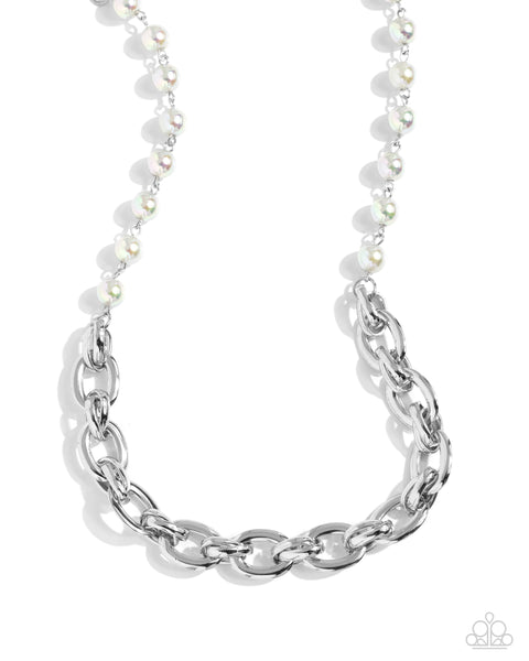 Necklace: Gleaming white pearls combine with oversized silver links to create a half-and-half fashionable mashup down the neckline for a refined, carefree finish. Features an adjustable clasp closure.