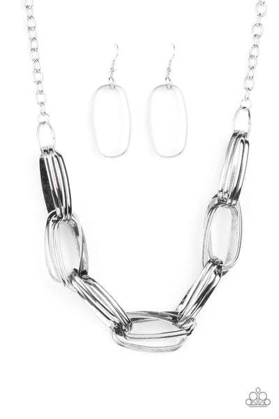 Brushed in an antiqued shimmer, pairs of oversized oval silver links dramatically connect into a gritty chain below the collar for a bold industrial look. Features an adjustable clasp closure.