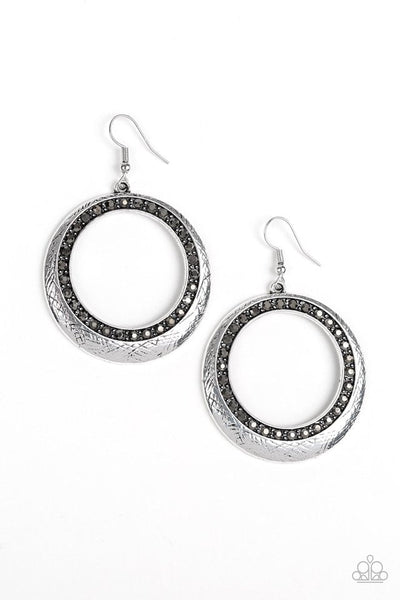 Delicately scratched in antiqued shimmer, a glistening silver hoop is encrusted in a ring of glittery hematite rhinestones for a refined look. Earring attaches to a standard fishhook fitting.