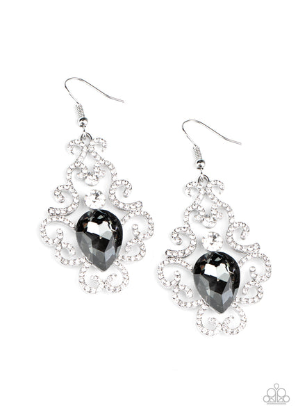 White rhinestone encrusted silver bars delicately vine around a white rhinestone and smoky teardrop rhinestone center, creating an unapologetic glow. Earring attaches to a standard fishhook fitting.