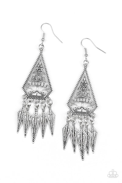 Embossed in tribal inspired patterns, a triangular frame gives way to shimmery silver feather-like frames, creating a free-spirited fringe. Earring attaches to a standard fishhook fitting.
