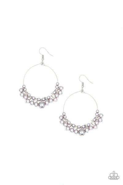 A cascade of silver pearls swing from the bottom of a silver wire hoop, creating a bubbly fringe. Earring attaches to a standard fishhook fitting.