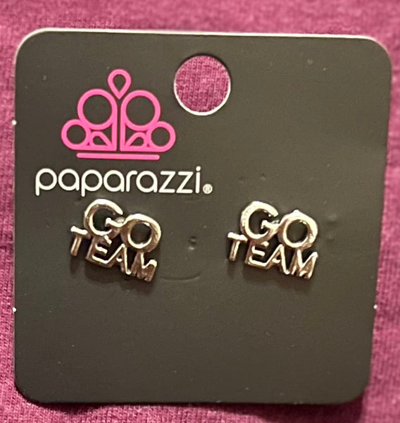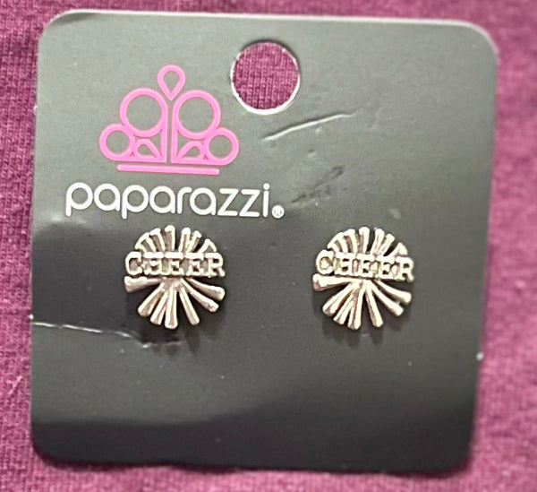 Pairs of earrings in assorted colors and shapes. Featuring antiqued silver finishes, the cheerleader inspired frames to include, a megaphone, a heart, pom poms, and frames that spell out "Go Team" and "#1Friend". Earrings attach to standard post fittings.