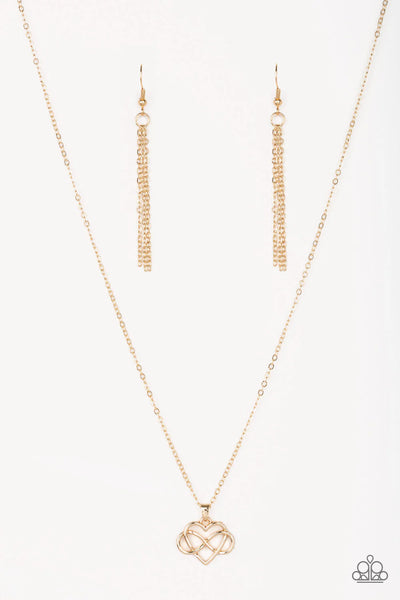 A glistening gold heart frame loops around a dainty infinity frame, coalescing into a romantic pendant below the collar. Features an adjustable clasp closure.