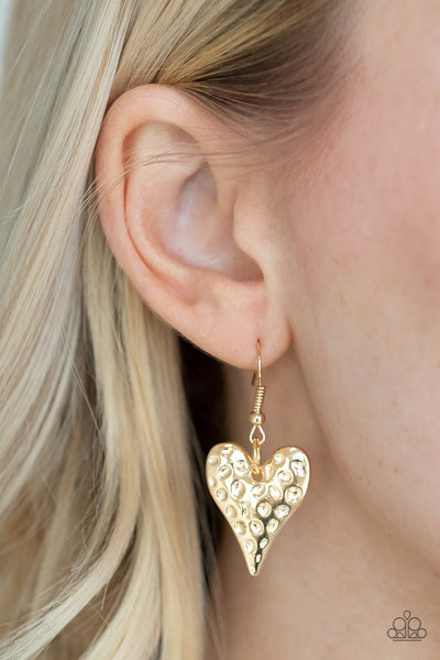 Hammered in glistening texture, mismatched gold heart frames swing from the bottom of a lengthened gold chain for a whimsical look. Features an adjustable clasp closure.