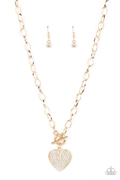 A blinding white rhinestone dotted gold heart frame sparkles from a toggle closure at the center of an oval gold linked chain for a flirtatious fashion. Features a toggle closure.