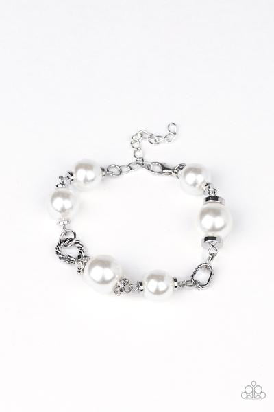 A classic collection of white pearls, white rhinestone encrusted rings, and ornate silver accents link across the wrist for a timeless look. Features an adjustable clasp closure.