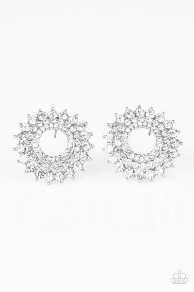 Gradually increasing in size, glassy white rhinestones are encrusted along three stacking silver frames for a regal look. Earring attaches to a standard post fitting.