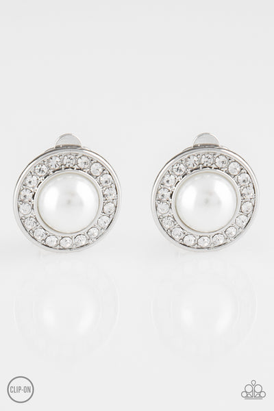 A ring of glassy white rhinestones spins around a white pearl-drop center for a timeless look. Earring attaches to a standard clip-on fitting.