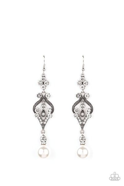 An oversized white pearl dangles from the bottom of a flowery silver frame dotted in sections of glassy white rhinestones for an elegant look. Earring attaches to a standard fishhook fitting.