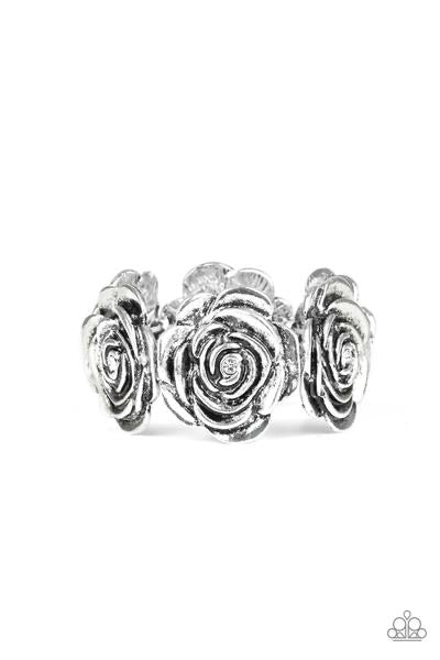 Dotted with dainty white rhinestone centers, a collection of oversized silver rosebud frames are threaded along stretchy bands around the wrist for a whimsical look.