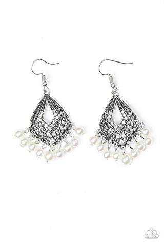 A pearly white fringe swings from the bottom of an ornate silver frame radiating with glassy white rhinestones for a refined look. Earring attaches to a standard fishhook fitting.