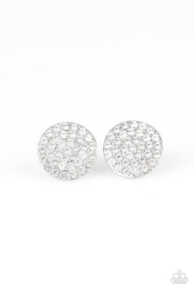 Countless white rhinestones are encrusted across the front of a beveled silver frame for a show-stopping look. Earring attaches to a standard post fitting.