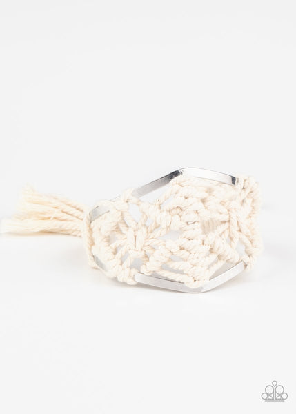 White cording decoratively knots and weaves around an airy silver cuff for a macramé inspired look. Knotted around the ends, white tassels flair out from bottoms of the cuff for a wanderlust finish.