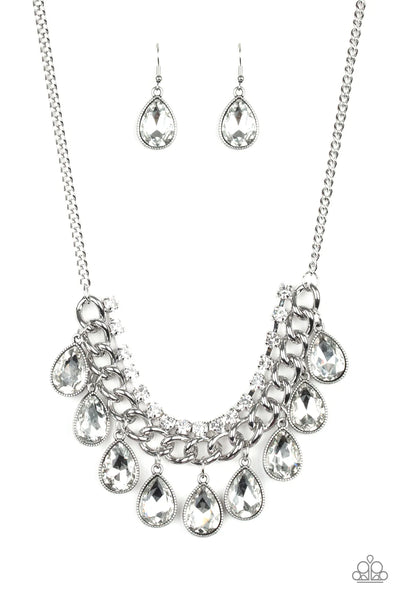Teardrop white rhinestones swing from the bottom of a bold silver chain, creating a dramatic fringe below the collar. A strand of glittery white rhinestones attach to the top of a shimmery silver chain, adding a refined flair to the flashy statement piece. Features an adjustable clasp closure.