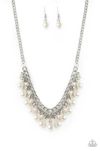 Necklace: Tiers of dainty silver heart charms, dainty white pearls, and larger white pearls cascade below the collar, creating a flirtatiously layered fringe. Features an adjustable clasp closure.