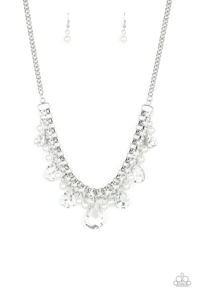 A glamorous collection of bubbly white pearls and exaggerated white teardrop gems dangle from a bold strand of white rhinestones, creating a knockout fringe below the collar. Features an adjustable clasp closure.