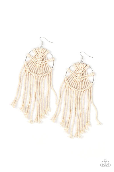 Soft twine is decoratively knotted around a silver hoop, creating a trendy tassel. Earring attaches to a standard fishhook fitting.