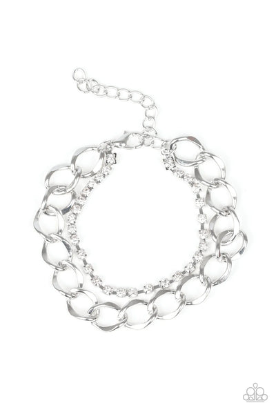 Pressed into sleek square frames, a strand of glittering white rhinestones joins a bulky silver chain around the wrist for an edgy-glam look. Features an adjustable clasp closure.