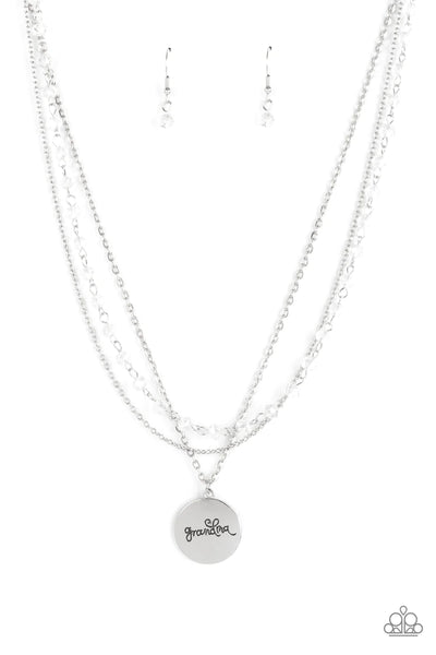 Infused with a strand of iridescent crystal-like beads, two dainty rows of mismatched silver chains delicately layer below the collar. Stamped in the word, "Grandma," a shiny silver disc swings from the lowest chain, creating a loving pendant. Features an adjustable clasp closure.