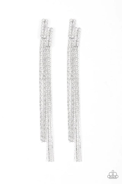 Radiating with dainty white rhinestones, asymmetrically stacked frames give way to strands of flat silver chains, creating an edgy chandelier. Earring attaches to a standard post fitting.