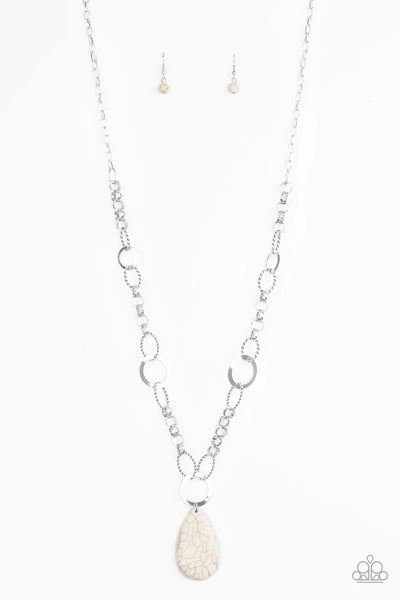A mismatched collection of bold silver links, textured silver ovals, and flat silver rings connect down the chest, creating a unique chain. Chiseled into a tranquil teardrop, a refreshing white stone pendant swings from the bottom of the metallic compilation for an earthy finish. Features an adjustable clasp closure.