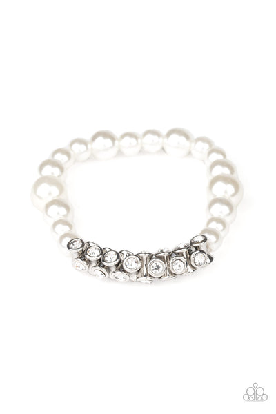 A collection of white pearls and white rhinestone dotted silver frames are threaded along stretchy bands around the wrist, creating a sparkling centerpiece.